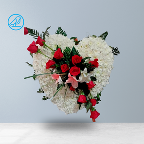 "Un elegante tributo de amor y respeto, esta corona de flores blanca en forma de corazón está adornada con vibrantes rosas rojas, creando un contraste impactante. El fondo blanco simboliza pureza y paz, mientras que las rosas rojas expresan amor profundo y duradero. Un homenaje conmovedor y lleno de significado para honrar la memoria de un ser querido."