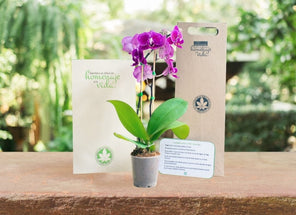 Presentación cuidadosa: La orquídea se entrega en una maceta sencilla y elegante, acompañada de la tarjeta y la bolsa de presentación a juego, creando un detalle armonioso y respetuoso.
